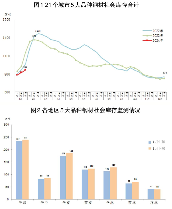 1月下旬,21個城市5大品種鋼材社會庫存866萬噸,環(huán)比增加43萬噸,上升5.2%,庫存連續(xù)4旬上升;比今年初增加137萬噸,上升18.8%;比去年同期減少292萬噸,下降25.2%。