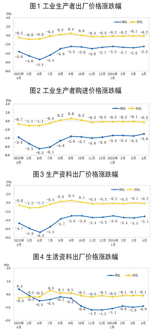4月份,工業生產者出廠價格中,生產資料價格同比下降3.1%、環比下降0.2%。影響工業生產者出廠價格總水平同比下降約2.32個百分點、環比下降約0.17個百分點。其中,采掘工業價格同比下降4.8%、環比下降1.0%,原材料工業價格同比下降1.9%、環比上漲0.3%,加工工業價格同比下降3.6%、環比下降0.4%。生活資料價格同比下降0.9%、環比下降0.1%。影響工業生產者出廠價格總水平同比下降約0.22個百分點、環比下降約0.03個百分點。其中,食品價格同比下降0.8%、環比下降0.1%,衣著價格同比上漲0.3%,一般日用品價格同比上漲0.1%、環比上漲0.3%,耐用消費品價格同比下降1.9%、環比下降0.5%。