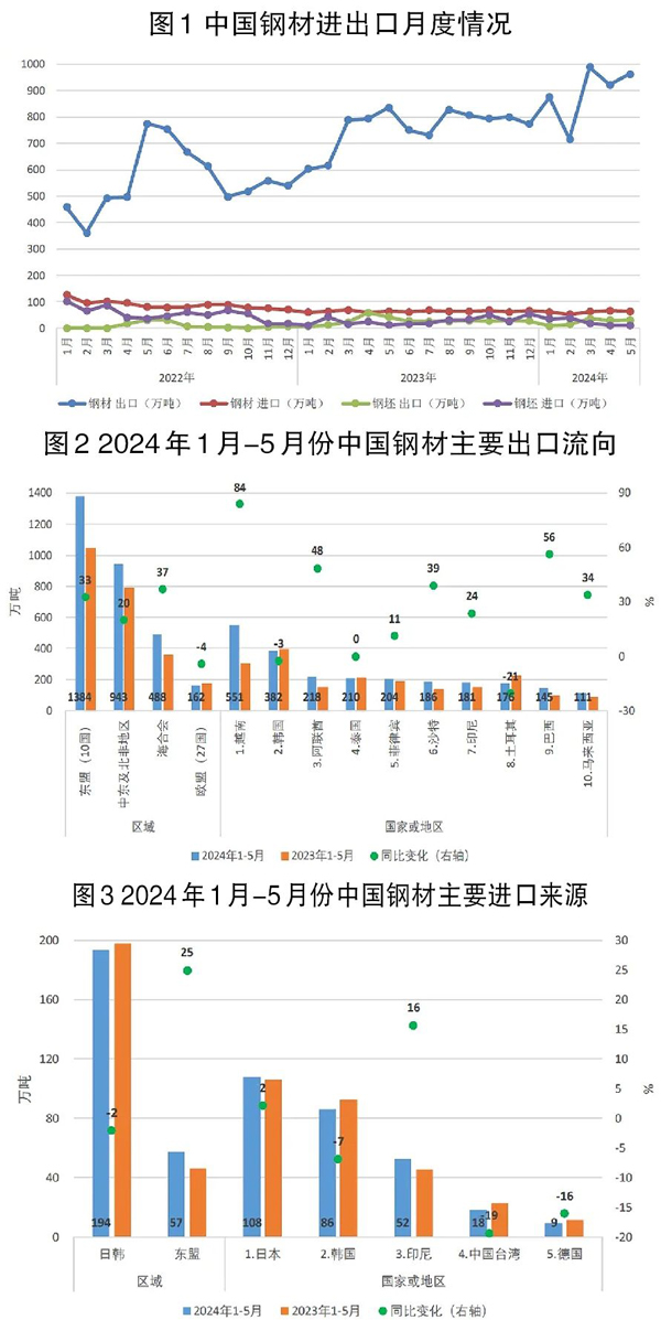 1月—5月份,我國出口鋼材4465.5萬噸,同比增長24.7%;出口平均單價為780.2美元/噸,同比下跌29.0%;出口鋼坯116.3萬噸,同比下降17.4%;粗鋼凈出口4321.5萬噸,同比增長891.0萬噸,增幅為26.0%。我國進口鋼材304.3萬噸,同比下降2.7%;進口平均單價為1658.3美元/噸,同比下跌4.1%;進口鋼坯110.9萬噸,同比增長8.0%。
