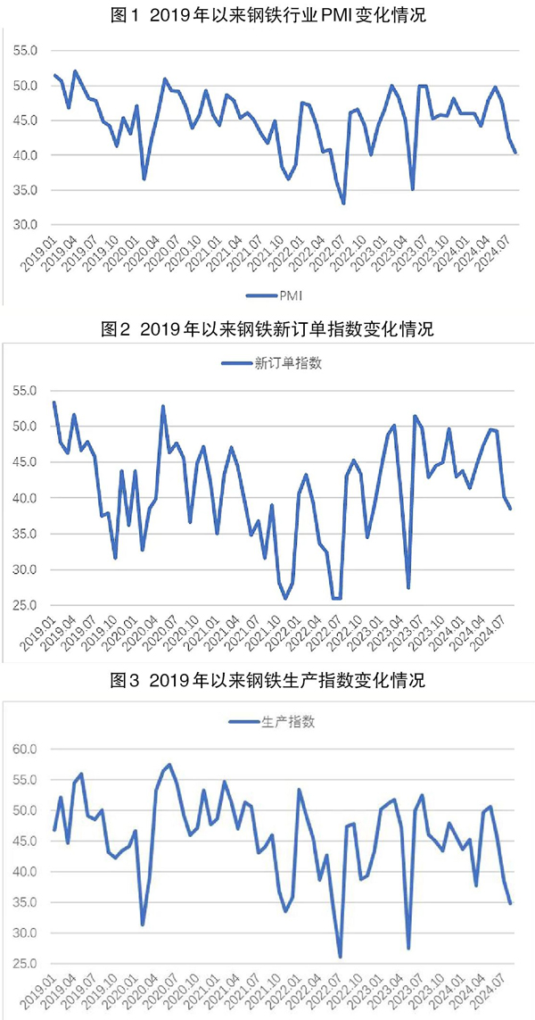 從中物聯鋼鐵物流專業委員會調查、發布的鋼鐵行業PMI(采購經理指數)來看,8月份為40.4%,環比下降2.1個百分點,顯示鋼鐵行業繼續走弱。分項指數變化顯示,鋼鐵行業淡季特征仍較明顯,市場需求下行持續,鋼鐵生產有所縮減,鋼廠庫存繼續增加,原材料價格低位運行,鋼材價格觸底反彈。預計9月份,在需求旺季預期帶動下,市場需求有所回升,鋼鐵生產小幅增長,原材料和鋼材價格均有上升。