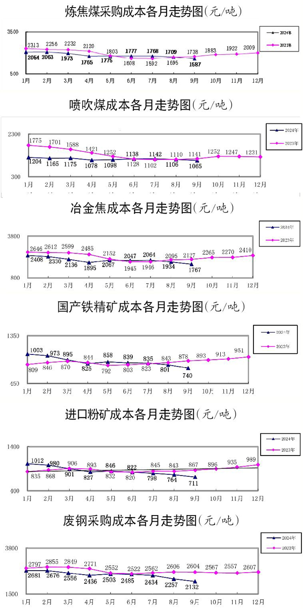 1月—9月份,煉焦煤采購成本同比下降4.90%;冶金焦采購成本同比下降9.69%;國產鐵精礦采購成本同比上升3.00%,進口粉礦采購成本同比下降1.16%;廢鋼采購成本同比下降7.54%。