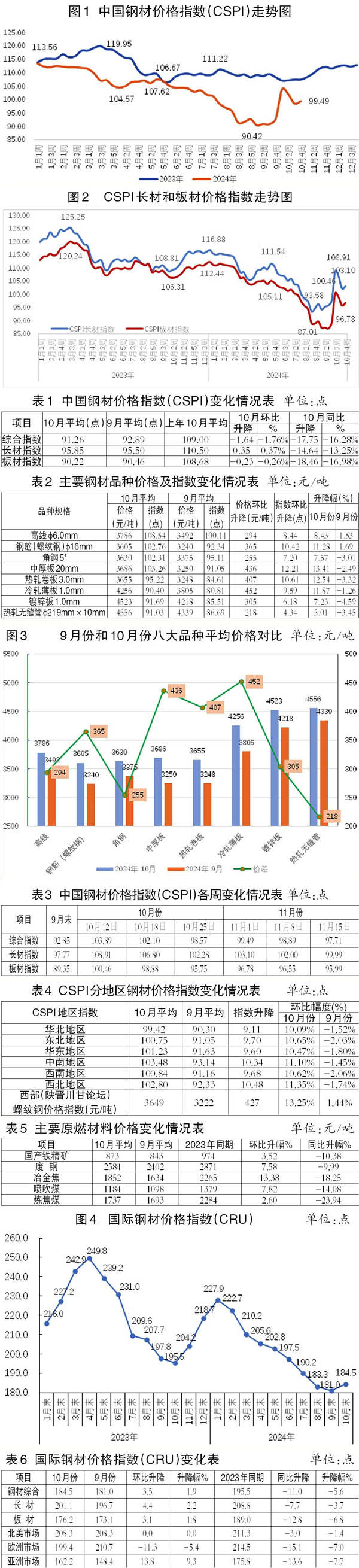 據(jù)中國鋼鐵工業(yè)協(xié)會(huì)監(jiān)測(cè),10月份,CSPI(中國鋼材價(jià)格指數(shù))平均值為101.01點(diǎn),環(huán)比上升9.76點(diǎn),升幅為10.69%;同比下降6.28點(diǎn),降幅為5.85%。其中,CSPI長(zhǎng)材指數(shù)平均值為105.27點(diǎn),環(huán)比上升9.42點(diǎn)、升幅為9.83%,同比下降4.08點(diǎn)、降幅為3.73%;板材指數(shù)平均值為97.97點(diǎn),環(huán)比上升10.25點(diǎn)、升幅為11.68%,同比下降8.54點(diǎn)、降幅為8.02%。