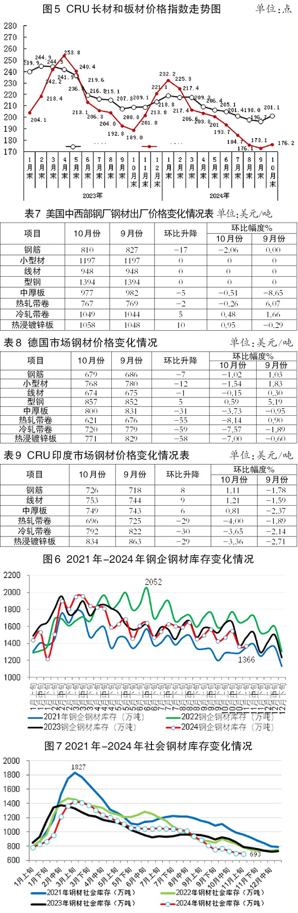 10月份,CRU長(zhǎng)材指數(shù)為201.1點(diǎn),環(huán)比上升4.4點(diǎn)、升幅為2.2%;CRU板材指數(shù)為176.2點(diǎn),環(huán)比上升3.1點(diǎn)、升幅為1.8%。與去年同期相比,CRU長(zhǎng)材指數(shù)下降7.7點(diǎn)、降幅為3.7%,CRU板材指數(shù)下降12.8點(diǎn)、降幅為6.8%。