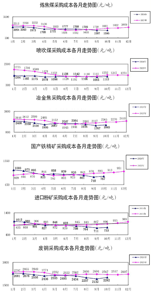 1月—10月份,煉焦煤采購(gòu)成本同比下降6.04%;冶金焦同比下降10.62%;國(guó)產(chǎn)鐵精礦同比上升1.20%,進(jìn)口粉礦同比下降2.99%;廢鋼同比下降8.02%。