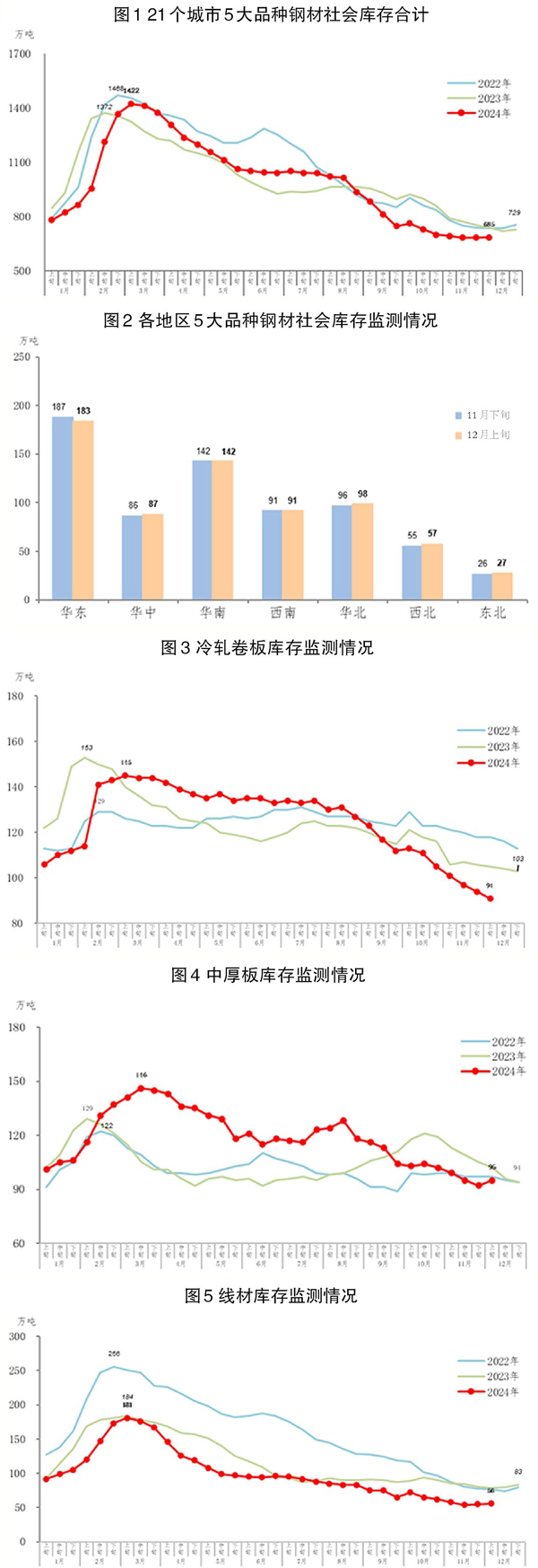 12月上旬,21個城市5大品種鋼材社會庫存為685萬噸,環比增加2萬噸,上升0.3%,庫存低位波動;比今年初減少44萬噸,下降6.0%;比上年同期減少52萬噸,下降7.1%。