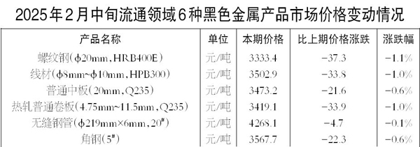 2月中旬,φ20毫米HRB400E螺紋鋼價格為3333.4元/噸,環比下降37.3元/噸,降幅為1.1%;φ8毫米—φ10毫米HPB300線材價格為3502.9元/噸,環比下降33.8元/噸,降幅為1.0%;20毫米Q235普通中板價格為3473.2元/噸,環比下降21.6元/噸,降幅為0.6%;4.75毫米—11.5毫米Q235熱軋普通卷板價格為3419.1元/噸,環比下降33.9元/噸,降幅為1.0%;φ219毫米×6毫米φ20#無縫鋼管價格為4268.1元/噸,環比下降4.7元/噸,降幅為0.1%;5#角鋼價格為3567.7元/噸,環比下降22.3元/噸,降幅為0.6%。 (郭同炬)