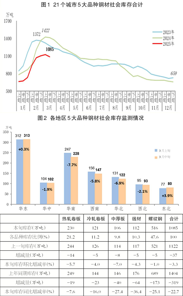 3月中旬,21個城市5大品種鋼材社會庫存為1085萬噸,環比減少37萬噸,下降3.3%,庫存由升轉降;比今年初增加426萬噸,上升64.6%;比上年同期減少319萬噸,下降22.7%。