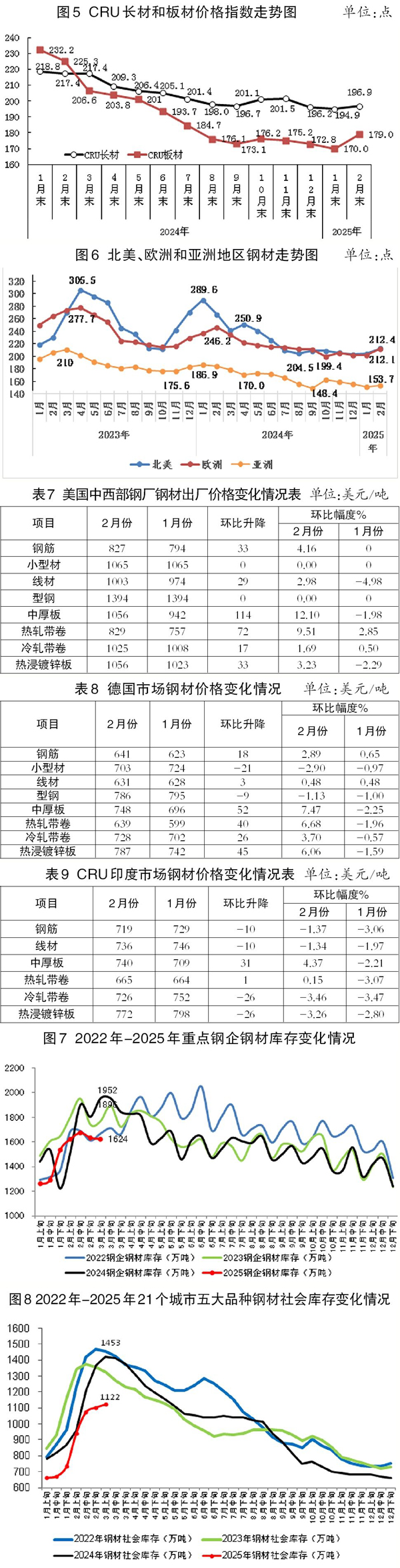 2月份,CRU長(zhǎng)材指數(shù)為196.9點(diǎn),環(huán)比上升2.0點(diǎn)、升幅為1.0%;CRU板材指數(shù)為179.0點(diǎn),環(huán)比上升9.0點(diǎn)、升幅為5.3%。與去年同期相比,2月份CRU長(zhǎng)材指數(shù)下降20.5點(diǎn)、降幅為9.4%;CRU板材指數(shù)下降46.3點(diǎn)、降幅為20.6%。