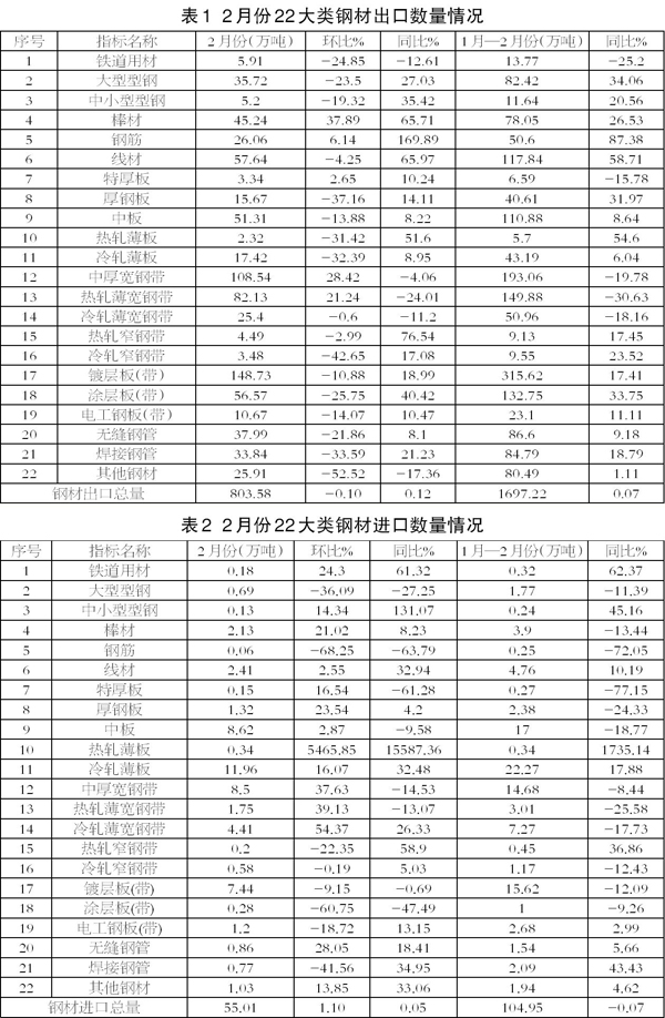2月份,我國出口鋼材803.6萬噸,環比下降10.1%;出口均價為678.3美元/噸,環比下降8.9%。我國進口鋼材55萬噸,環比增長10.2%;進口均價為1587.4美元/噸,環比下降6.3%。