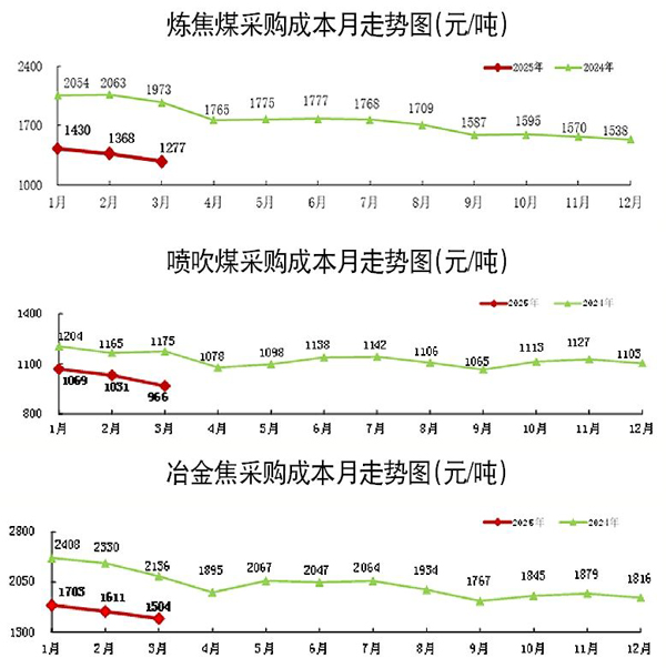 3月份,煉焦煤加權(quán)平均折算成干基的采購成本為1276.70元/噸,環(huán)比減少91.18元/噸,下降6.67%;第1季度累計(jì)平均折算成干基的采購成本為1358.28元/噸,同比減少678.76元/噸,下降33.32%。