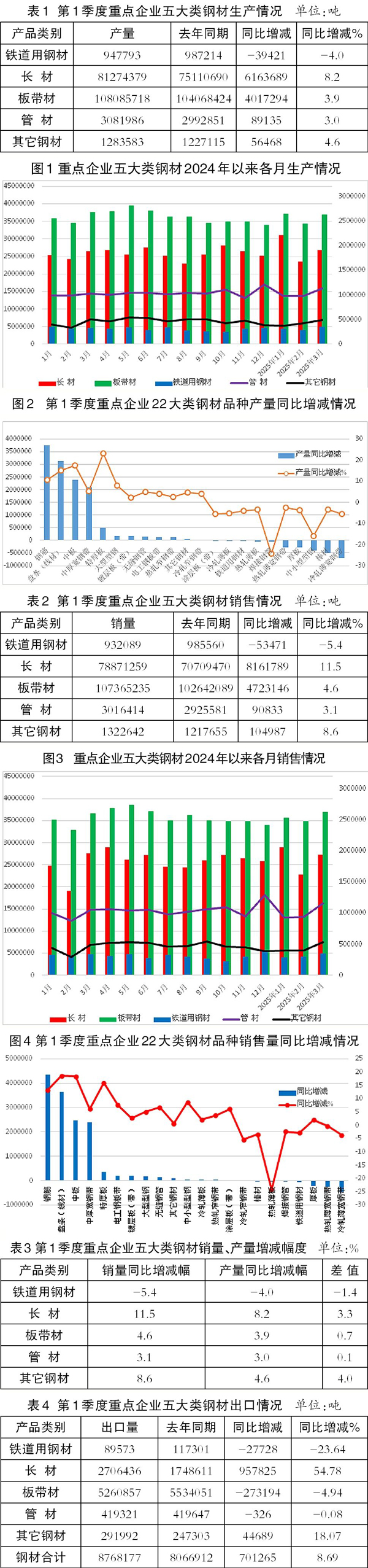 第1季度,重點企業鋼材產量、銷售量,特別是鋼筋、線材等長材產量、銷售量同比增長較多,應是在2024年底一系列提振經濟政策、2024年第4季度多地舉行重大項目集中開工活動等因素的作用下,鋼材貿易商等市場參與者推進“冬儲”、加大對鋼筋等品種的采購力度的結果。