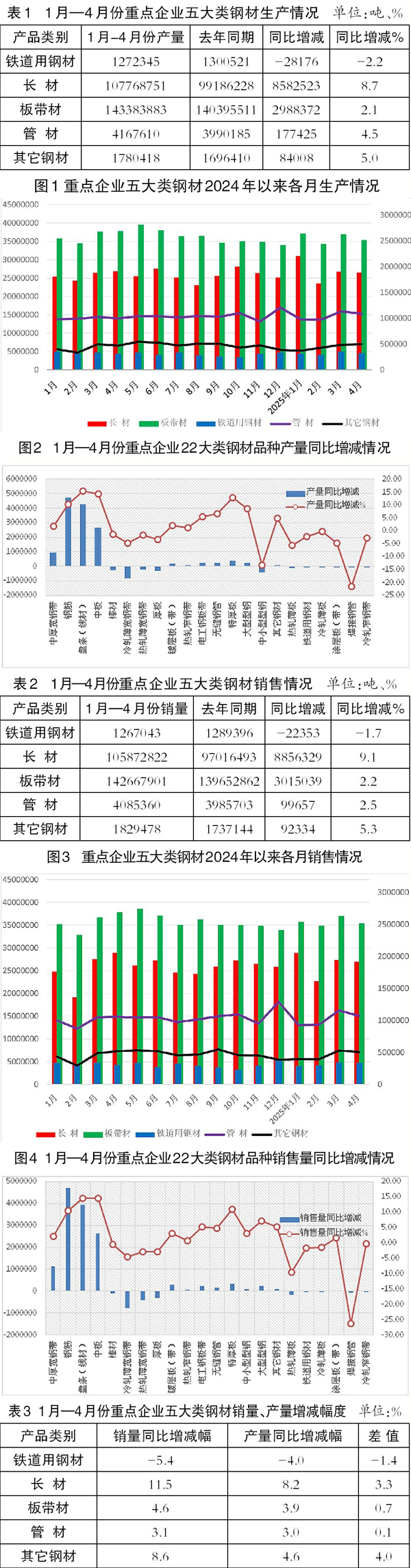 據此計算,1月—4月份,重點企業鋼材產銷率為99.0%,較1月—3月份(98.4%)上升0.6個百分點,較2024年同期(98.8%)上升0.2個百分點,較2024年全年(99.1%)下降0.1個百分點。