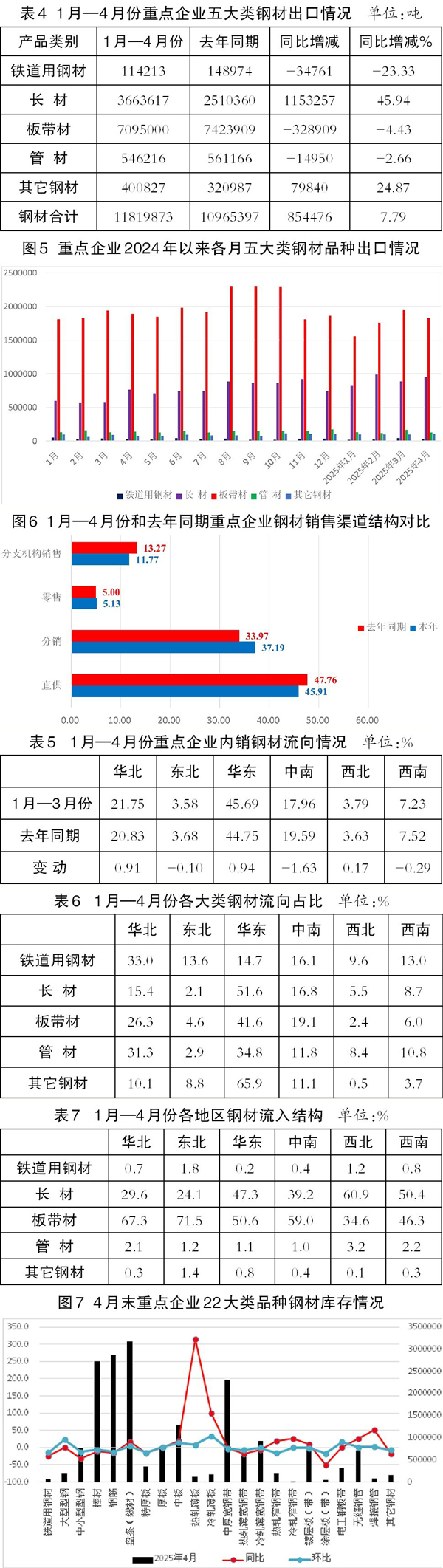 在鋼材內銷中,通過直供、分銷、零售、分支機構銷售的占比分別為45.9%、37.2%、5.1%、11.8%。和2024年全年總體情況相比,1月—4月份通過直供和分支機構銷售的占比都出現了下降。其中,通過直供渠道的占比下降1.8個百分點,通過分支機構渠道銷售的占比下降0.5個百分點,而通過分銷渠道的占比則上升2.3個百分點,通過零售渠道的占比持平。和去年同期相比,1月—4月份重點企業通過直供渠道的占比和分支機構銷售渠道的占比分別下降1.9個和1.5個百分點,通過分銷渠道的占比和零售渠道的占比分別提升3.3個和0.1個百分點。