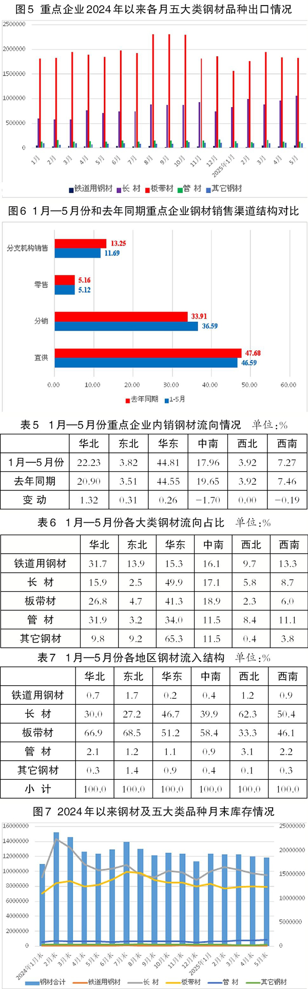 1月—5月份,重點企業鋼材內銷按照區域流入量統計,華東地區、華北地區、中南地區是主要流入地區,鋼材流入合計量占重點企業內銷鋼材總量的85.0%,比去年同期下降0.1個百分點。