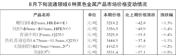 8月下旬,φ20毫米HRB400E螺紋鋼市場價格為3218.2元/噸,環(huán)比下降42.8元/噸,降幅達(dá)1.3%;φ8毫米~10毫米HPB300線材市場價格為3356.5元/噸,環(huán)比下降48.9元/噸,降幅達(dá)1.4%;20毫米Q235普通中板市場價格為3525.8元/噸,環(huán)比下降15.5元/噸,降幅達(dá)0.4%;4.75毫米~11.5毫米Q235熱軋普通卷板市場價格為3444.9元/噸,環(huán)比下降37.4元/噸,降幅達(dá)1.1%;φ219毫米×6毫米20#無縫鋼管市場價格為4162.5元/噸,環(huán)比下降10.0元/噸,降幅達(dá)0.2%;5#角鋼市場價格為3531.4元/噸,環(huán)比下降17.1元/噸,降幅達(dá)0.5%。 (郭同炬)