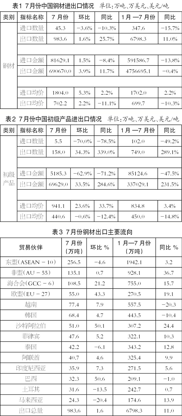 1月—7月份,我國累計出口鋼材6798.3萬噸,同比增長11.0%;出口均價為699.7美元/噸,同比下跌10.3%。我國累計進口鋼材347.6萬噸,同比下降15.7%;進口均價為1702.0美元/噸,同比上漲2.2%。