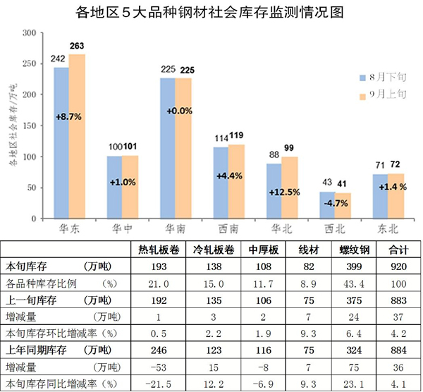 9月上旬,分地區(qū)來看,7大區(qū)域的鋼材社會庫存,除西北地區(qū)環(huán)比下降、華南地區(qū)環(huán)比持平外,其他區(qū)域均有所上升。其中,華東地區(qū)為增量最大地區(qū),華北地區(qū)為增幅最大地區(qū),具體情況見圖。