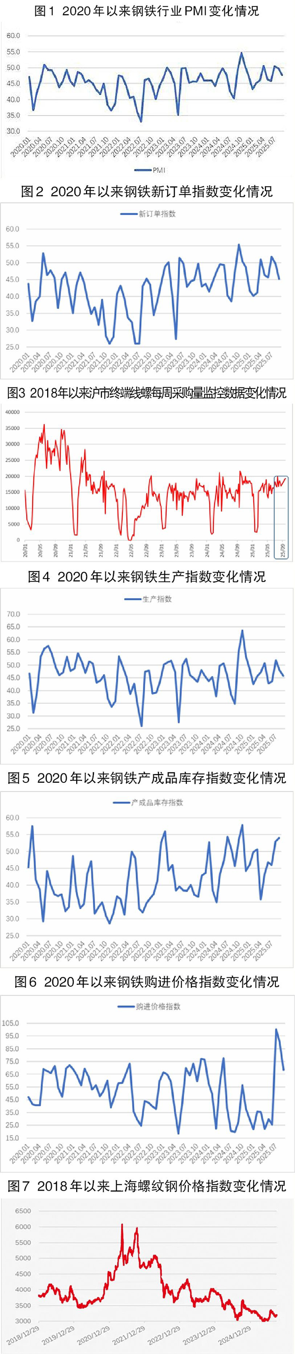 原材料價(jià)格繼續(xù)高位運(yùn)行,煉鋼成本壓力持續(xù)加大。9月份,由于鋼廠生產(chǎn)活動(dòng)有所放緩,鋼廠原材料采購(gòu)活動(dòng)同步趨緩,采購(gòu)量指數(shù)環(huán)比下降5個(gè)百分點(diǎn)至48.5%,結(jié)束連續(xù)2個(gè)月在擴(kuò)張區(qū)間運(yùn)行態(tài)勢(shì),并創(chuàng)下第2季度以來的新低,但煉鋼原材料價(jià)格仍保持高位運(yùn)行,購(gòu)進(jìn)價(jià)格指數(shù)連續(xù)3個(gè)月運(yùn)行在60%以上的高位區(qū)間。9月份,分品種來看,鐵礦石價(jià)格呈現(xiàn)沖高回落運(yùn)行態(tài)勢(shì),9月上旬受“反內(nèi)卷”消息及旺季預(yù)期提振,下旬終端需求不及預(yù)期導(dǎo)致價(jià)格波動(dòng)下行,但整體較8月份仍有上升;焦炭的供給端持續(xù)偏緊,價(jià)格繼續(xù)維持在較高水平;廢鋼價(jià)格也有上升態(tài)勢(shì)。整體來看,9月份的原材料價(jià)格繼續(xù)高位運(yùn)行,煉鋼成本壓力持續(xù)加大。