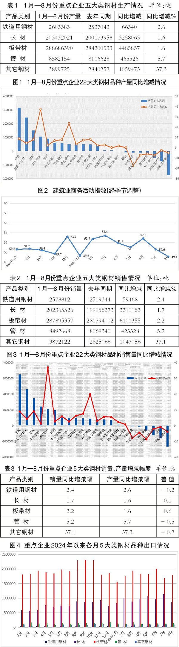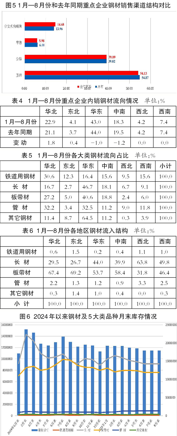今年前8個(gè)月,重點(diǎn)企業(yè)內(nèi)銷鋼材量為48098.8萬(wàn)噸,內(nèi)銷占比為95.2%,與2024年全年及去年同期持平;同比增加887.5萬(wàn)噸,增長(zhǎng)1.9%。