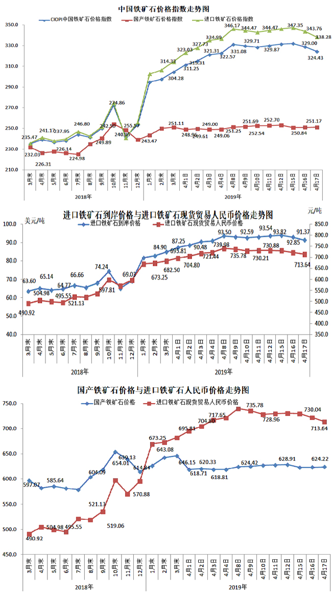 4月17日,中國鐵礦石價格指數(CIOPI)324.43點,環比下降4.57點,降幅為1.39%。其中:國產鐵礦石價格指數為251.17點,環比上升0.27點,升幅為0.11%;進口鐵礦石價格指數為338.28點,環比下降5.48點,降幅為1.59%。