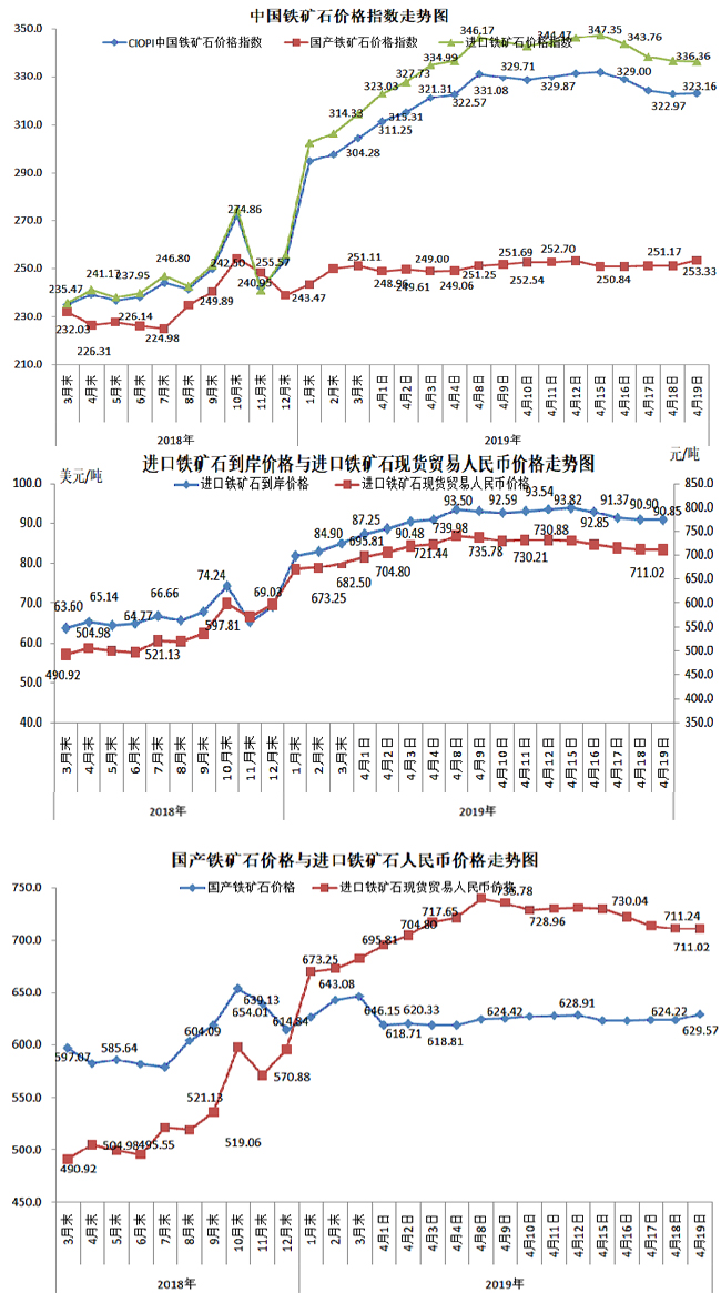 4月19日,中國鐵礦石價格指數(CIOPI)323.16點,環比上升0.19點,升幅為0.06%。其中:國產鐵礦石價格指數為253.33點,環比上升2.15點,升幅為0.86%;進口鐵礦石價格指數為336.36點,環比下降0.19點,降幅為0.06%。