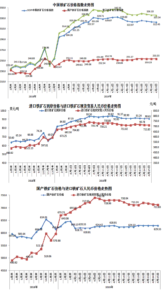 4月25日,中國鐵礦石價格指數(CIOPI)322.45點,環比下降0.47點,降幅為0.14%。其中:國產鐵礦石價格指數為253.23點,環比持平;進口鐵礦石價格指數為335.54點,環比下降0.56點,降幅為0.17%。