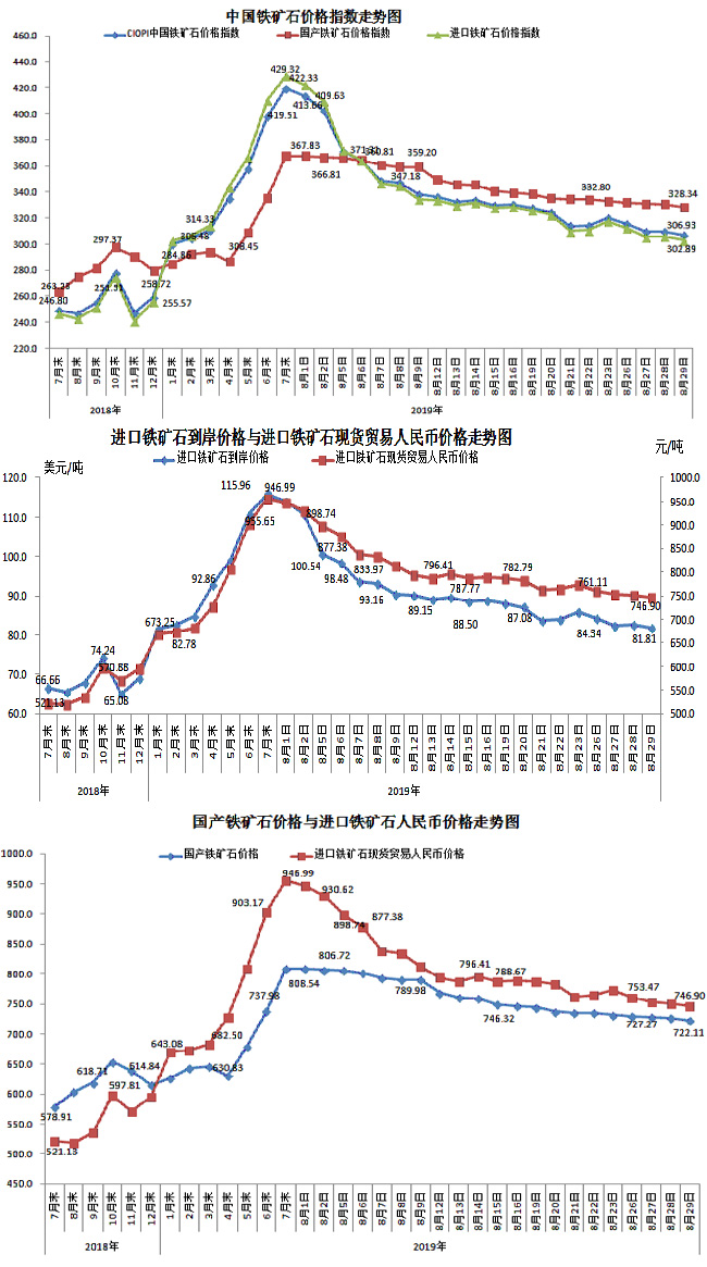8月29日,中國(guó)鐵礦石價(jià)格指數(shù)(CIOPI)306.93點(diǎn),環(huán)比下降2.90點(diǎn),降幅為0.93%。其中:國(guó)產(chǎn)鐵礦石價(jià)格指數(shù)為328.34點(diǎn),環(huán)比下降2.35點(diǎn),降幅為0.71%;進(jìn)口鐵礦石價(jià)格指數(shù)為302.89點(diǎn),環(huán)比下降3.00點(diǎn),降幅為0.98%。