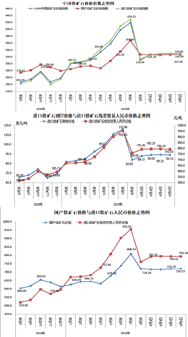 9月5日,中國鐵礦石價格指數(shù)(CIOPI)329.59點,環(huán)比下降0.31點,降幅為0.09%。其中:國產(chǎn)鐵礦石價格指數(shù)為327.48點,環(huán)比上升0.43點,升幅為0.13%;進(jìn)口鐵礦石價格指數(shù)為329.99點,環(huán)比下降0.44點,降幅為0.13%。