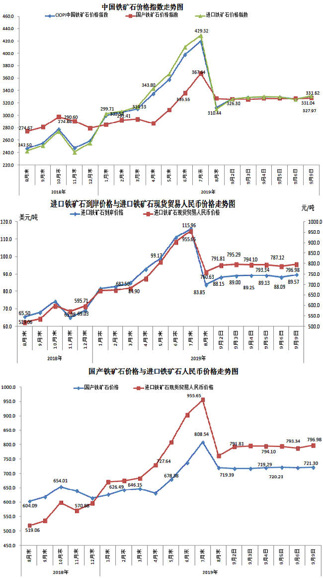 9月9日,現(xiàn)貨貿(mào)易進(jìn)口鐵礦石62%品位干基粉礦人民幣含稅價(jià)格為796.98元/噸,環(huán)比每噸上升9.86元,升幅為1.25%,當(dāng)月平均價(jià)格為793.11元/噸。
