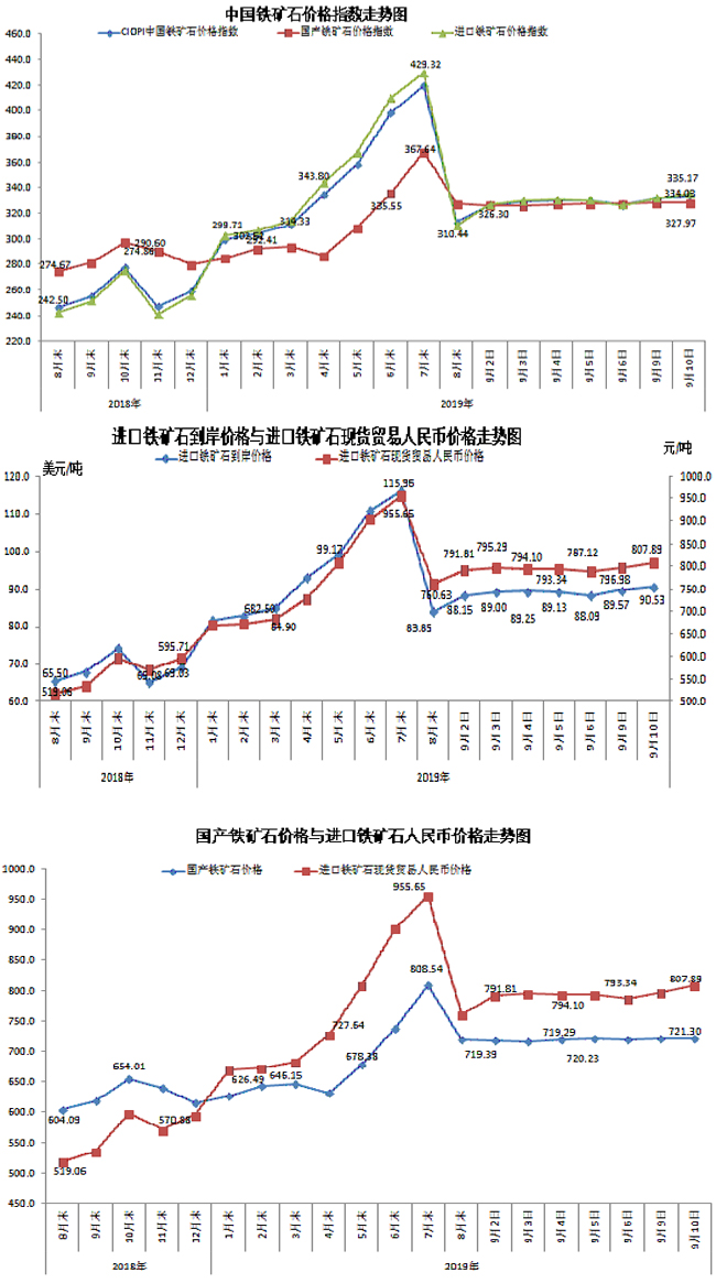 9月10日,中國鐵礦石價格指數(CIOPI)334.03點,環比上升2.99點,升幅為0.90%。其中:國產鐵礦石價格指數為327.97點,環比持平;進口鐵礦石價格指數為335.17點,環比上升3.55點,升幅為1.07%。