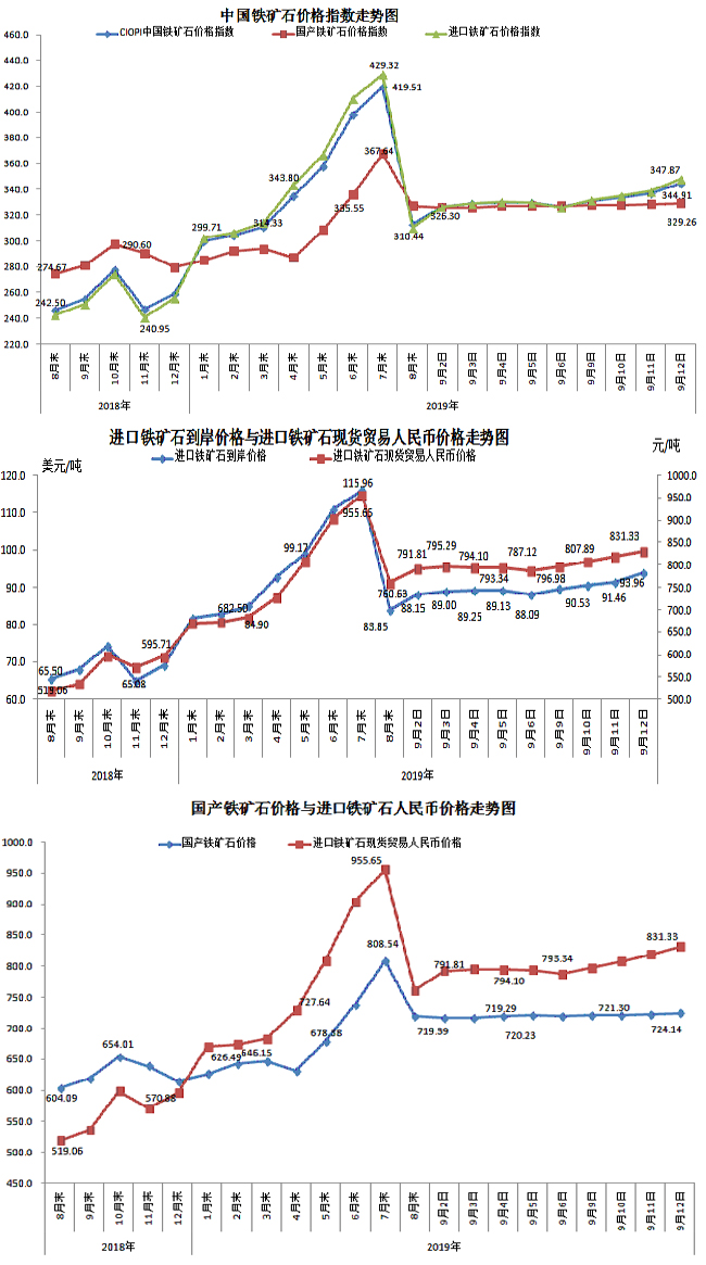 9月12日,中國鐵礦石價(jià)格指數(shù)(CIOPI)344.91點(diǎn),環(huán)比上升7.91點(diǎn),升幅為2.35%。其中:國產(chǎn)鐵礦石價(jià)格指數(shù)為329.26點(diǎn),環(huán)比上升0.79點(diǎn),升幅為0.24%;進(jìn)口鐵礦石價(jià)格指數(shù)為347.87點(diǎn),環(huán)比上升9.26點(diǎn),升幅為2.73%。