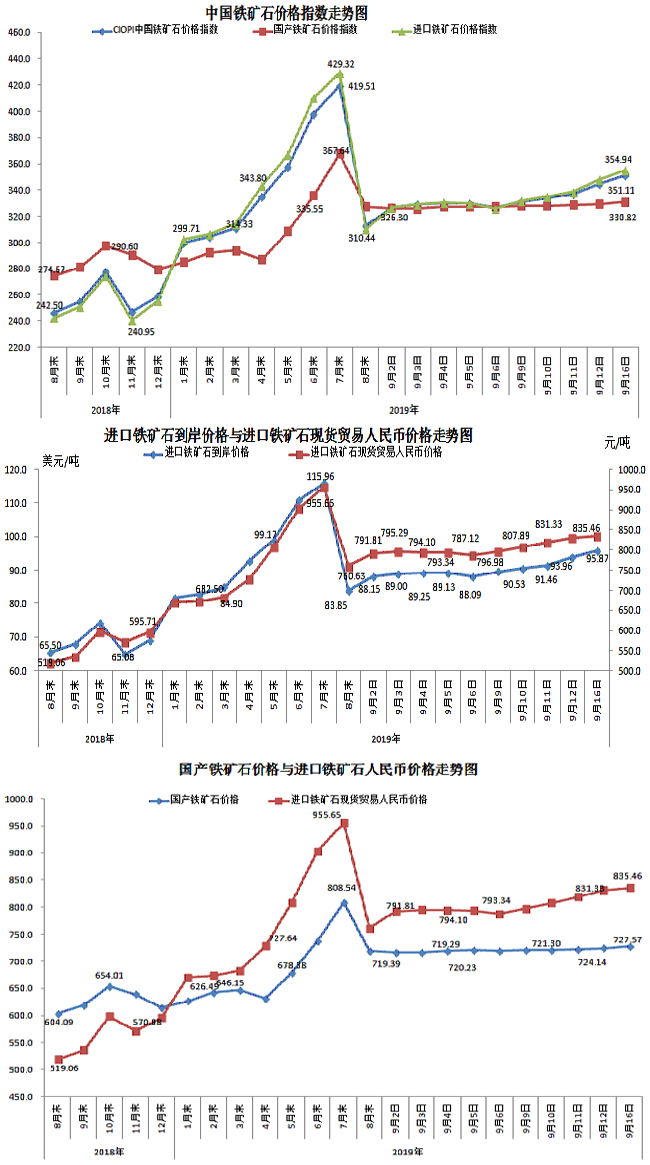 9月16日,中國鐵礦石價格指數(shù)(CIOPI)351.11點,環(huán)比上升6.19點,升幅為1.80%。其中:國產(chǎn)鐵礦石價格指數(shù)為330.82點,環(huán)比上升1.56點,升幅為0.47%;進口鐵礦石價格指數(shù)為354.94點,環(huán)比上升7.07點,升幅為2.03%。
