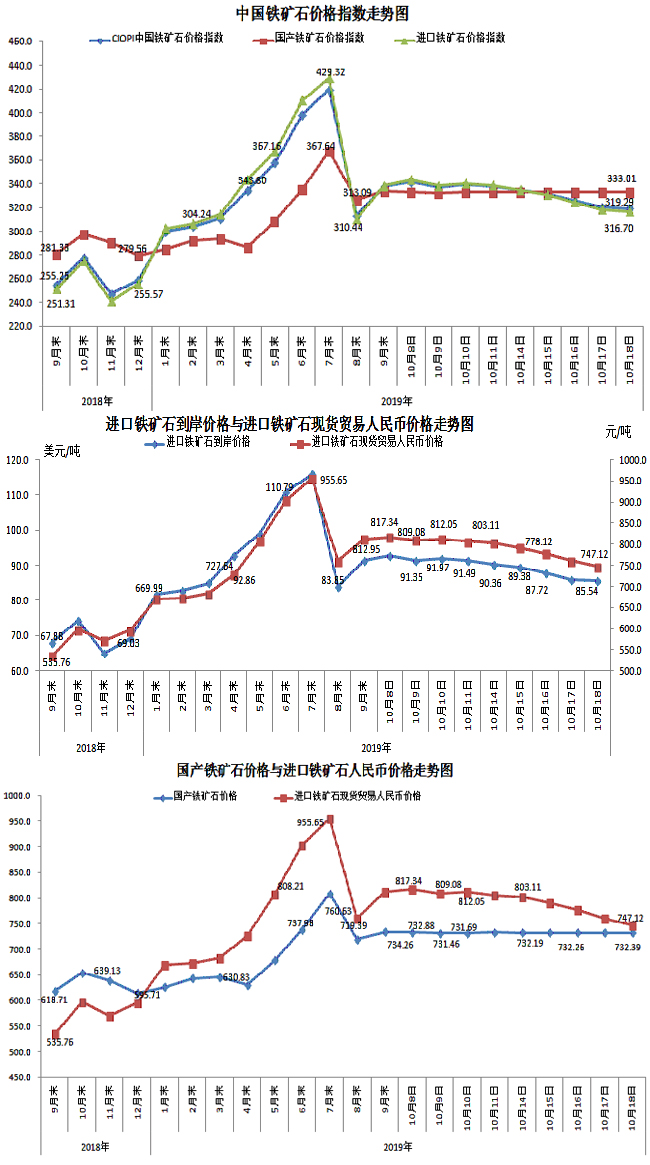 10月18日,中國鐵礦石價格指數(CIOPI)319.29點,環比下降1.28點,降幅為0.40%。其中:國產鐵礦石價格指數為333.01點,環比持平;進口鐵礦石價格指數為316.70點,環比下降1.52點,降幅為0.48%。