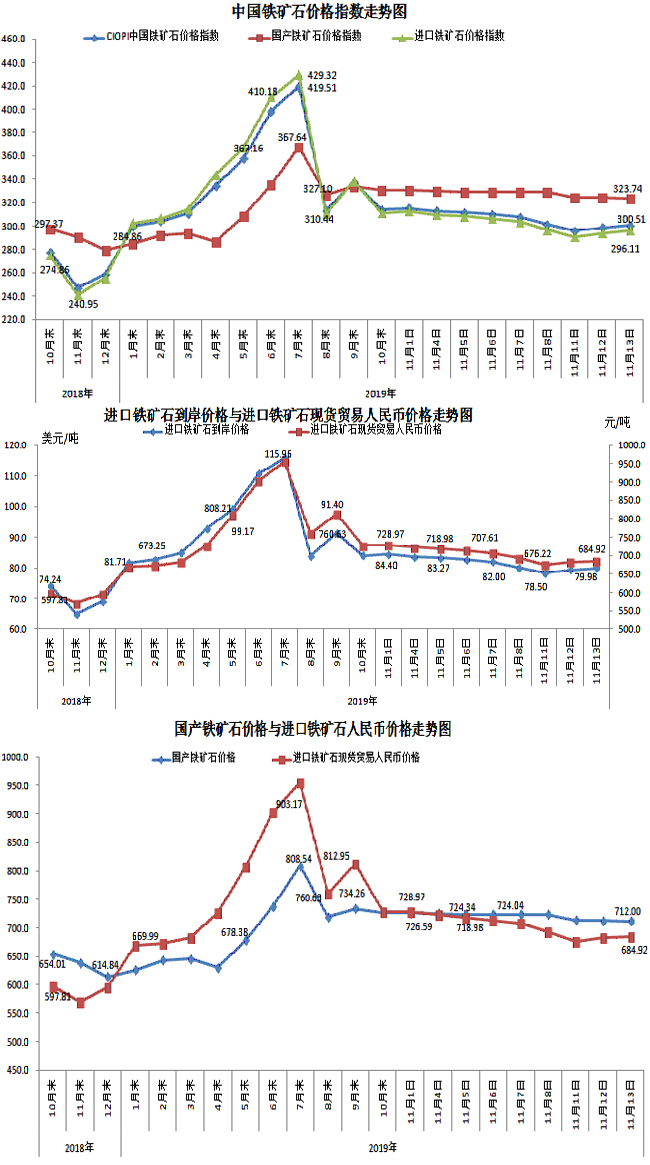 11月13日,中國鐵礦石價格指數(shù)(CIOPI)300.51點,環(huán)比上升1.70點,升幅為0.57%。其中:國產(chǎn)鐵礦石價格指數(shù)為323.74點,環(huán)比下降0.64點,降幅為0.20%;進口鐵礦石價格指數(shù)為296.11點,環(huán)比上升2.15點,升幅為0.73%。