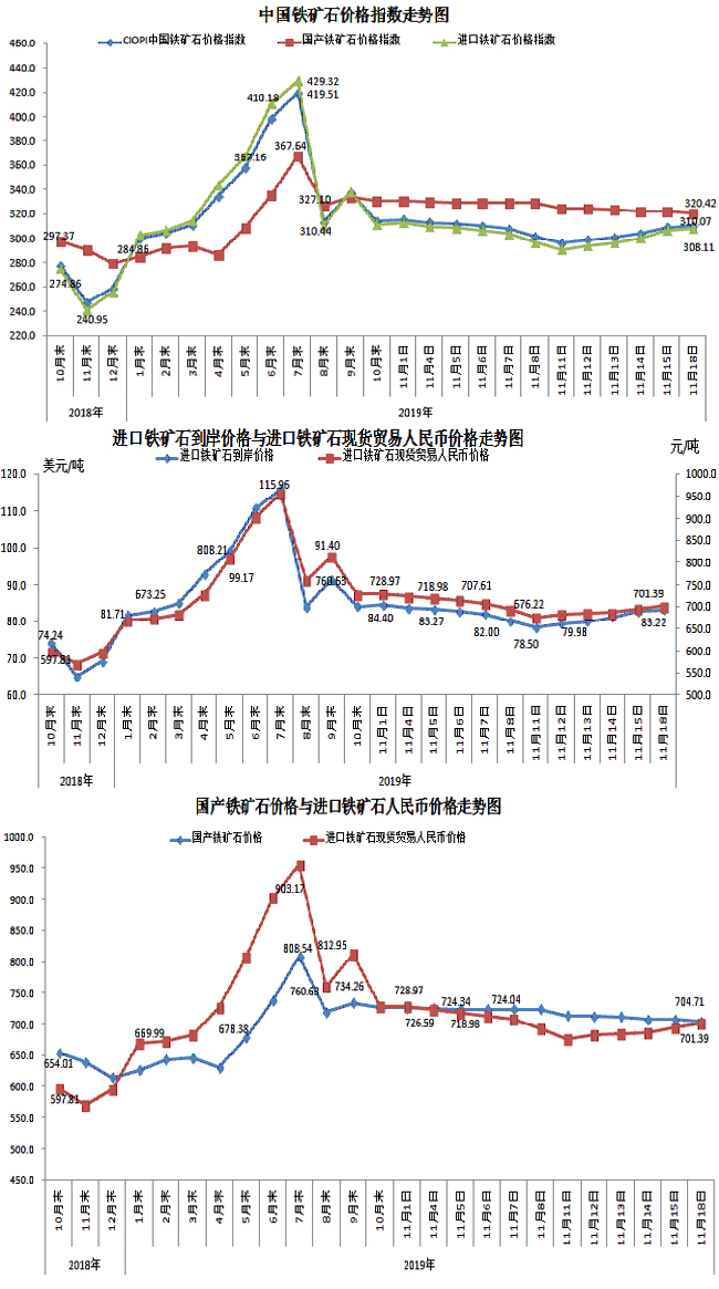 11月18日,中國鐵礦石價格指數(CIOPI)310.07點,環比上升1.05點,升幅為0.34%。其中:國產鐵礦石價格指數為320.42點,環比下降1.60點,降幅為0.50%;進口鐵礦石價格指數為308.11點,環比上升1.55點,升幅為0.51%。