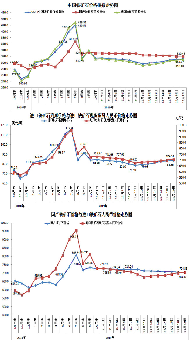 11月19日,現貨貿易進口鐵礦石62%品位干基粉礦人民幣含稅價格為704.32元/噸,環比每噸上升2.93元,升幅為0.42%,當月平均價格為701.33元/噸。
