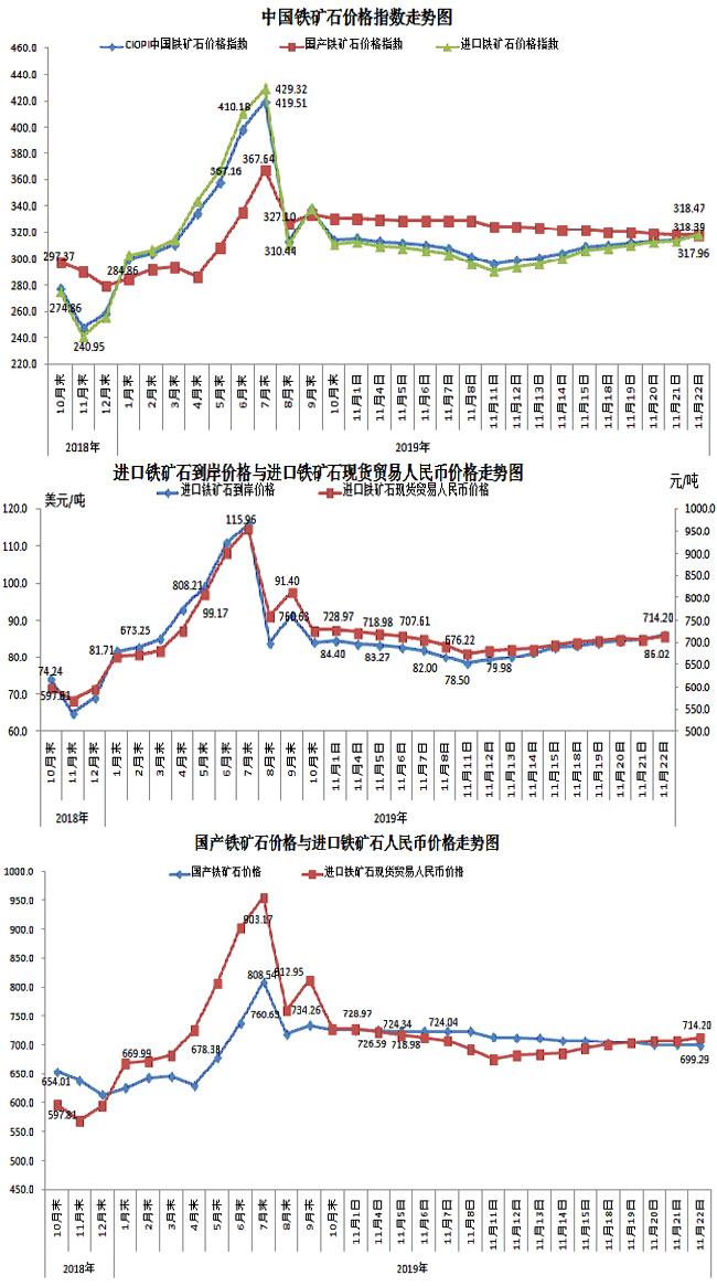11月22日,國(guó)產(chǎn)鐵礦石62%品位干基鐵精礦含稅價(jià)格為699.29元/噸,環(huán)比每噸下降1.03元,降幅為0.15%;比進(jìn)口鐵礦石降14.91元/噸,降幅為2.09%;當(dāng)月平均價(jià)格為713.34元/噸,比進(jìn)口鐵礦石高10.34元/噸,升幅為1.47%。