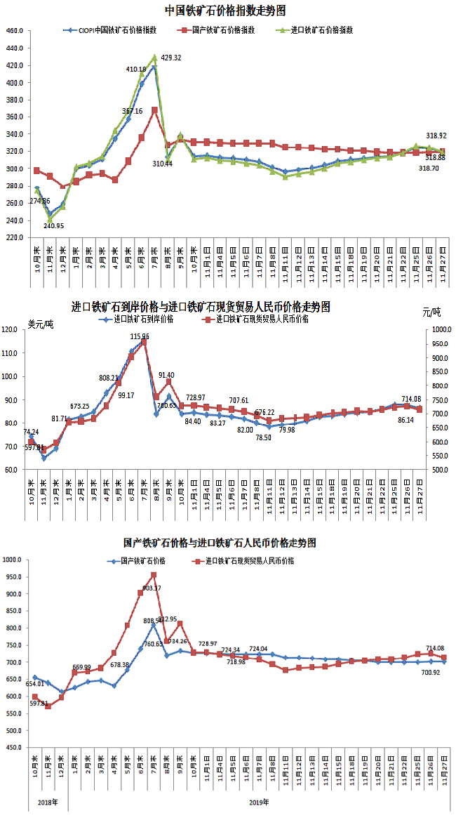 11月27日,中國鐵礦石價格指數(CIOPI)318.88點,環比下降4.86點,降幅為1.50%。其中:國產鐵礦石價格指數為318.70點,環比持平;進口鐵礦石價格指數為318.92點,環比下降5.78點,降幅為1.78%。