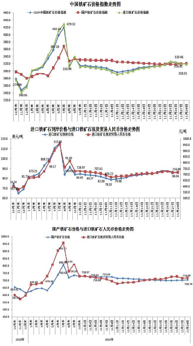 11月28日,現(xiàn)貨貿(mào)易進(jìn)口鐵礦石62%品位干基粉礦人民幣含稅價(jià)格為716.99元/噸,環(huán)比每噸上升2.91元,升幅為0.41%,當(dāng)月平均價(jià)格為706.41元/噸。