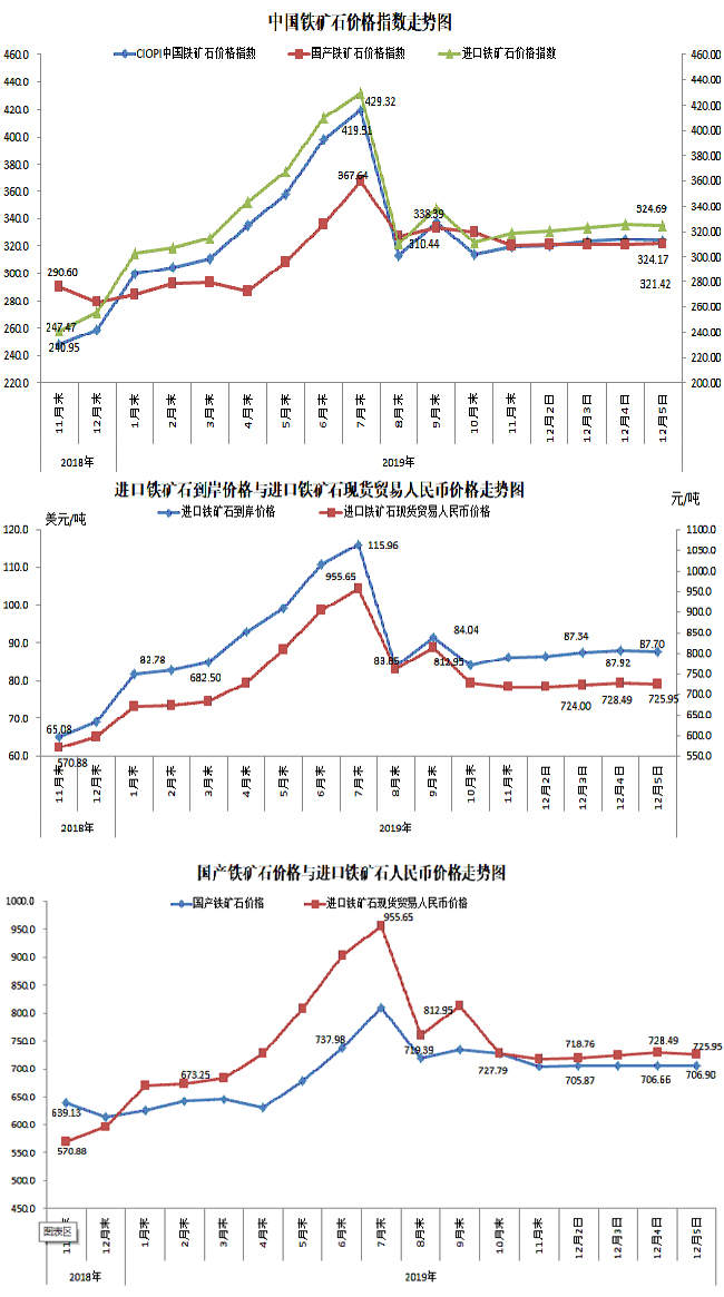 12月5日,中國鐵礦石價格指數(shù)(CIOPI)324.17點,環(huán)比下降0.67點,降幅為0.21%。其中:國產(chǎn)鐵礦石價格指數(shù)為321.42點,環(huán)比上升0.11點,升幅為0.03%;進(jìn)口鐵礦石價格指數(shù)為324.69點,環(huán)比下降0.81點,降幅為0.25%。