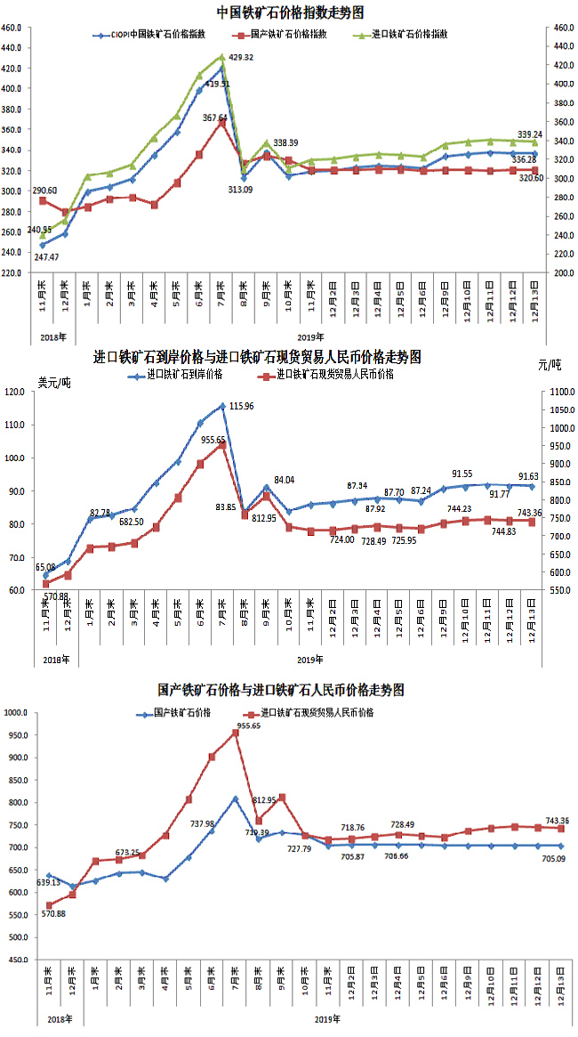 12月13日,中國鐵礦石價格指數(shù)(CIOPI)336.28點,環(huán)比下降0.44點,降幅為0.13%。其中:國產(chǎn)鐵礦石價格指數(shù)為320.60點,環(huán)比持平;進口鐵礦石價格指數(shù)為339.24點,環(huán)比下降0.52點,降幅為0.15%。