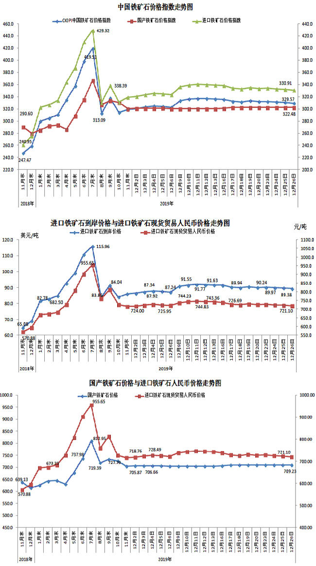 12月26日,中國鐵礦石價格指數(shù)(CIOPI)329.57點,環(huán)比下降1.26點,降幅為0.38%。其中:國產(chǎn)鐵礦石價格指數(shù)為322.48點,環(huán)比上升0.10點,升幅為0.03%;進(jìn)口鐵礦石價格指數(shù)為330.91點,環(huán)比下降1.52點,降幅為0.46%。