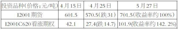 從實際行情來看,鐵礦石價格在4月整體處于振蕩狀態,直至5月中旬價格才進入了明顯的上漲行情。若投資者于4月15日入場,選擇較為中長期的2001合約,假設當時鐵礦石期權已經上市,理論上買入一手I2001期貨與買入一手I2001C620看漲期權的運行情況對比如下(以收盤價、歷史波動率作為期權理論價格計算依據):