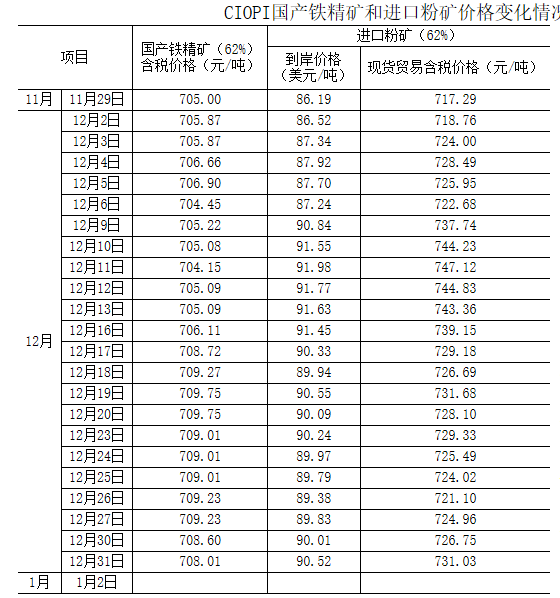 從全月情況看:國產鐵精礦平均含稅價格為707.28元/噸,比上月下降3.42元/噸,降幅為0.48%;進口粉礦平均到岸價格為89.85美元/噸,比上月上升6.31美元/噸,升幅為7.55%。(見下表)