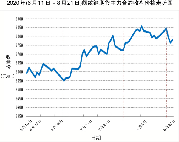 8月份,螺紋鋼主力合約價(jià)格繼續(xù)保持7月份上升之勢(shì),輕松突破3800元/噸整數(shù)點(diǎn)關(guān)口。8月上旬和中旬,螺紋鋼主力合約的收盤(pán)價(jià)多在3800元/噸上下波動(dòng);最高價(jià)幾乎全部在3800元/噸以上運(yùn)行,最高沖至3888元/噸。上周五(8月21日)收盤(pán),螺紋鋼主力合約(RB2010)的收盤(pán)價(jià)、最高價(jià)和最低價(jià)與前一周末(8月14日)收盤(pán)時(shí)的對(duì)應(yīng)價(jià)格相比,分別回落16元/噸、2元/噸和8元/噸;但與7月底相比,螺紋鋼主力合約的對(duì)應(yīng)價(jià)格則分別上升6元/噸、20元/噸和42元/噸。螺紋鋼期貨主力合約最低價(jià)的明顯提升表明,盡管螺紋鋼期貨價(jià)格在8月中旬后期急劇下跌,但是在8月下旬,螺紋鋼期貨市場(chǎng)總體漲勢(shì)猶在。