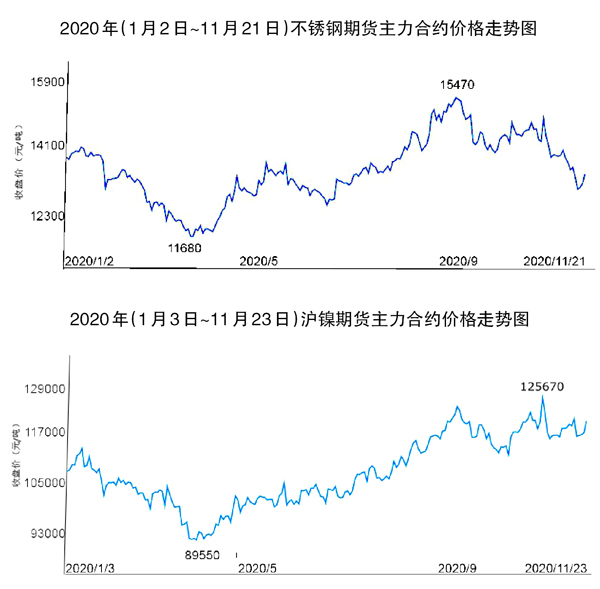 從2020年以來(1月2日~11月21日)不銹鋼期貨主力合約價格走勢圖可以看出,上周后期價格回升趨勢相當明顯,是11月份以來最強勁的一次價格反彈。這使得上周不銹鋼期貨價格下降幅度比前兩周顯著收窄,下跌的總體趨勢有所減緩。