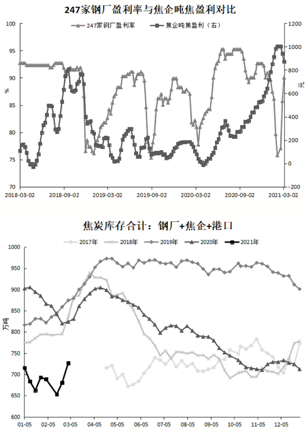 焦價(jià)兩輪調(diào)降后,焦化企業(yè)噸焦盈利繼續(xù)收窄,上周調(diào)研數(shù)據(jù)顯示,全國(guó)30家獨(dú)立焦企平均噸焦盈利為872元,環(huán)比下降70元,但仍大幅高于往年同期水平,焦企整體盈利情況依然良好。鋼廠利潤(rùn)方面,近期受粗鋼產(chǎn)量同比下降以及3月份終端需求恢復(fù)預(yù)期的提振,成材價(jià)格表現(xiàn)強(qiáng)勢(shì),使得鋼廠盈利率再度回升,上周五數(shù)據(jù)顯示,全國(guó)247家鋼廠盈利率為90.04%,環(huán)比前一周增加4.33個(gè)百分點(diǎn),同比增加3.46個(gè)百分點(diǎn)。鋼廠盈利情況好轉(zhuǎn),但空間依然較小,擴(kuò)張預(yù)期仍存,預(yù)計(jì)短期焦企仍有讓利行為。