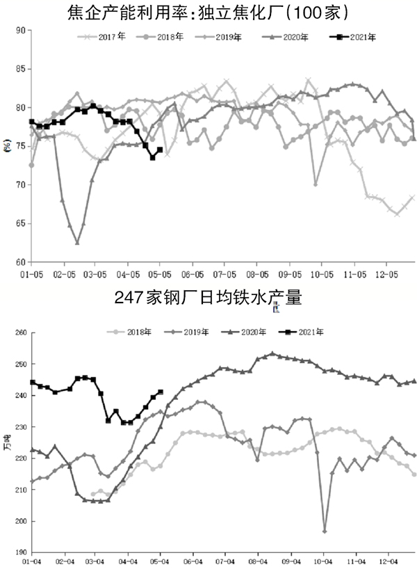 從需求端來(lái)看,自3月份河北省唐山市出臺(tái)鋼廠全年環(huán)保限產(chǎn)政策后,當(dāng)?shù)劁搹S高爐開(kāi)工、焦炭日耗等均出現(xiàn)明顯下降,焦炭需求快速走弱;近期隨著河北省唐山市限產(chǎn)回歸常態(tài)化,其他地區(qū)暫未出臺(tái)較嚴(yán)的限產(chǎn)政策,并且在需求旺季的拉動(dòng)下,鋼材價(jià)格持續(xù)攀升,鋼廠盈利情況較為可觀,大大刺激了其他地區(qū)鋼廠的生產(chǎn)積極性,進(jìn)而推動(dòng)焦炭需求持續(xù)回升。上周五(5月7日)數(shù)據(jù)顯示,247家樣本鋼廠高爐日均鐵水產(chǎn)量由前期低點(diǎn)231萬(wàn)噸持續(xù)回升至241萬(wàn)噸,高于往年同期。目前來(lái)看,鋼材仍處于需求旺季階段,鋼廠高爐生產(chǎn)暫時(shí)沒(méi)有政策阻力,日均鐵水產(chǎn)量有望進(jìn)一步增加,焦炭需求短期向好。