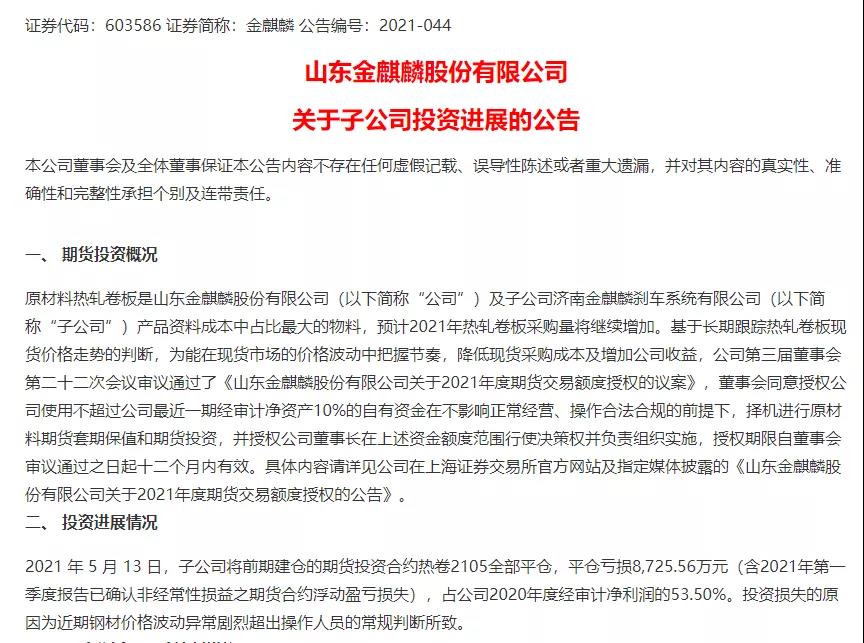 這則補充公告稱,從2020年5月開始至2021年5月13日期間,子公司(濟南金麒麟剎車系統有限公司)期貨賬戶共計交易熱卷2105合約(10%保證金率,2021年5月15日到期)13430手,截至2021年5月13日平倉,合計交易損失8725.56萬元。截至2021年5月14日下午收盤,子公司期貨賬戶僅還持有熱卷2110合約(10%保證金率,2021年10月15日到期)1800手,浮動虧損2737.48萬元。