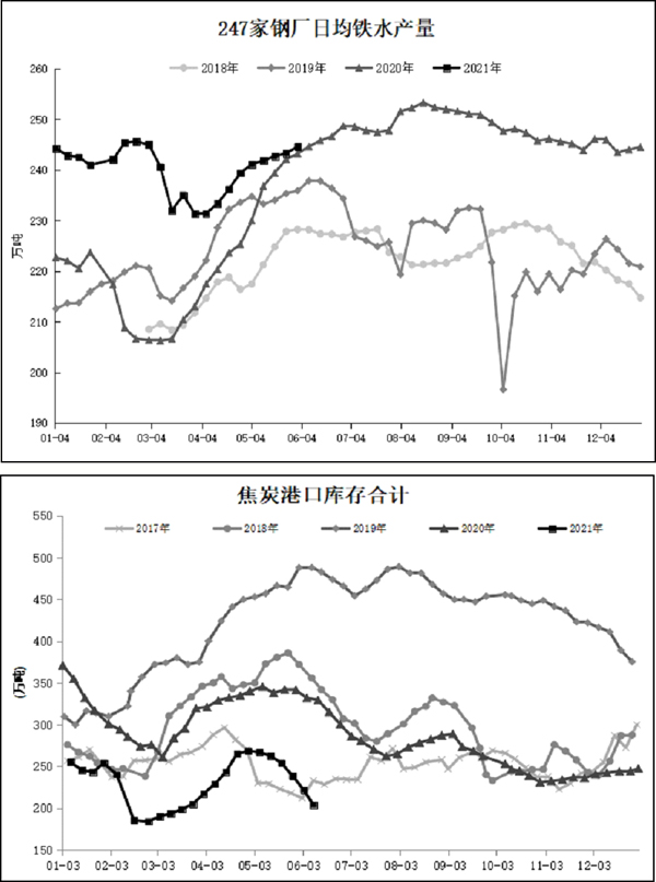需求方面,河北省唐山市“7+16”家鋼廠高爐仍維持50%和30%比例的限產。此外,近期河北省邯鄲市為應對不利天氣影響,發布強化重點行業生產調控的通知,管控時間自6月11日至6月30日,但從對鋼鐵行業的管控措施來看,此次限產主要是針對鋼廠的燒結工段,對高爐并未做出明確要求,這也就意味著當地焦炭真實需求受影響的程度不大。但值得注意的是,鋼材周度調研數據顯示,螺紋鋼、熱卷均呈庫存增、消費降趨勢,終端需求步入淡季跡象較為明顯,后期可能會向上游逐步傳導。上周,247家鋼廠高爐日均鐵水產量為244.06萬噸,環比小幅下降0.53萬噸。